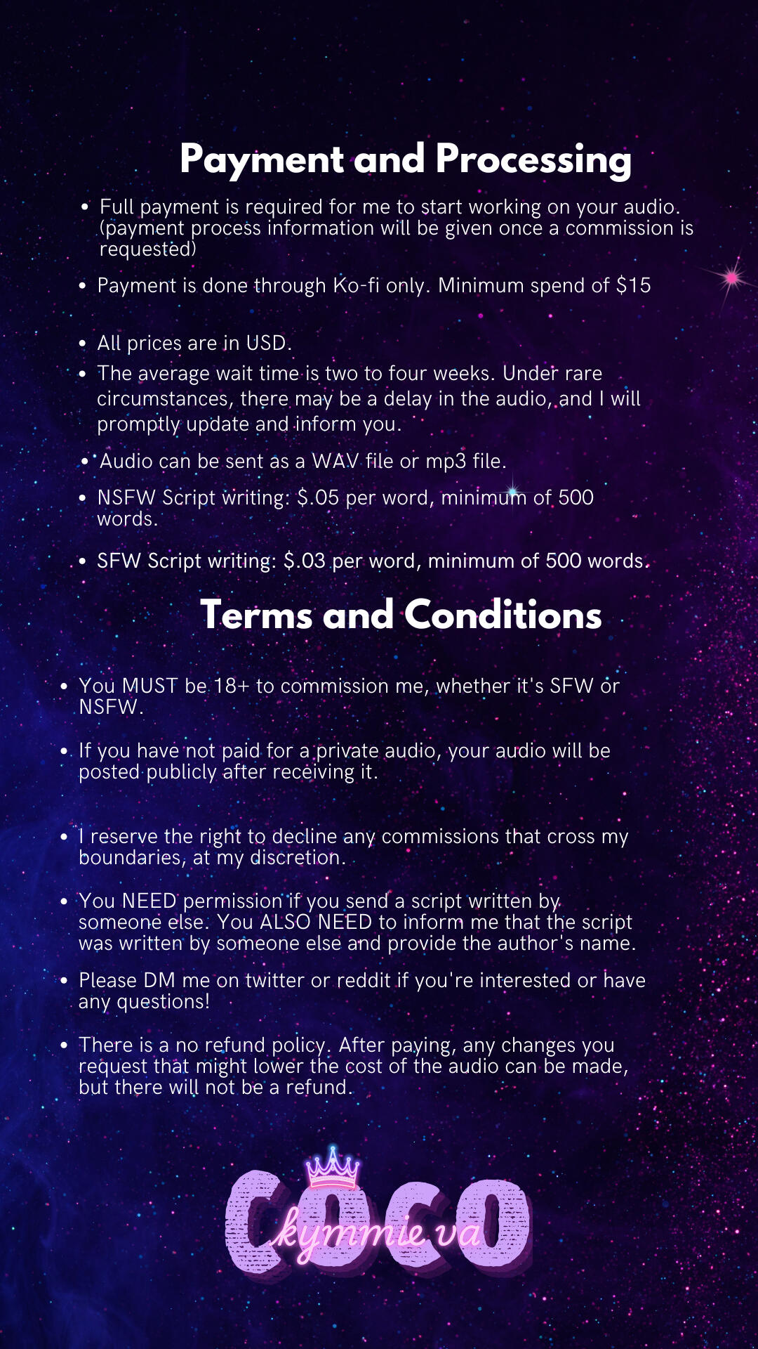 All artwork commissioned by and featuring CocoKymmieVa. Artists credited above each piece. Please do not repost without permission.